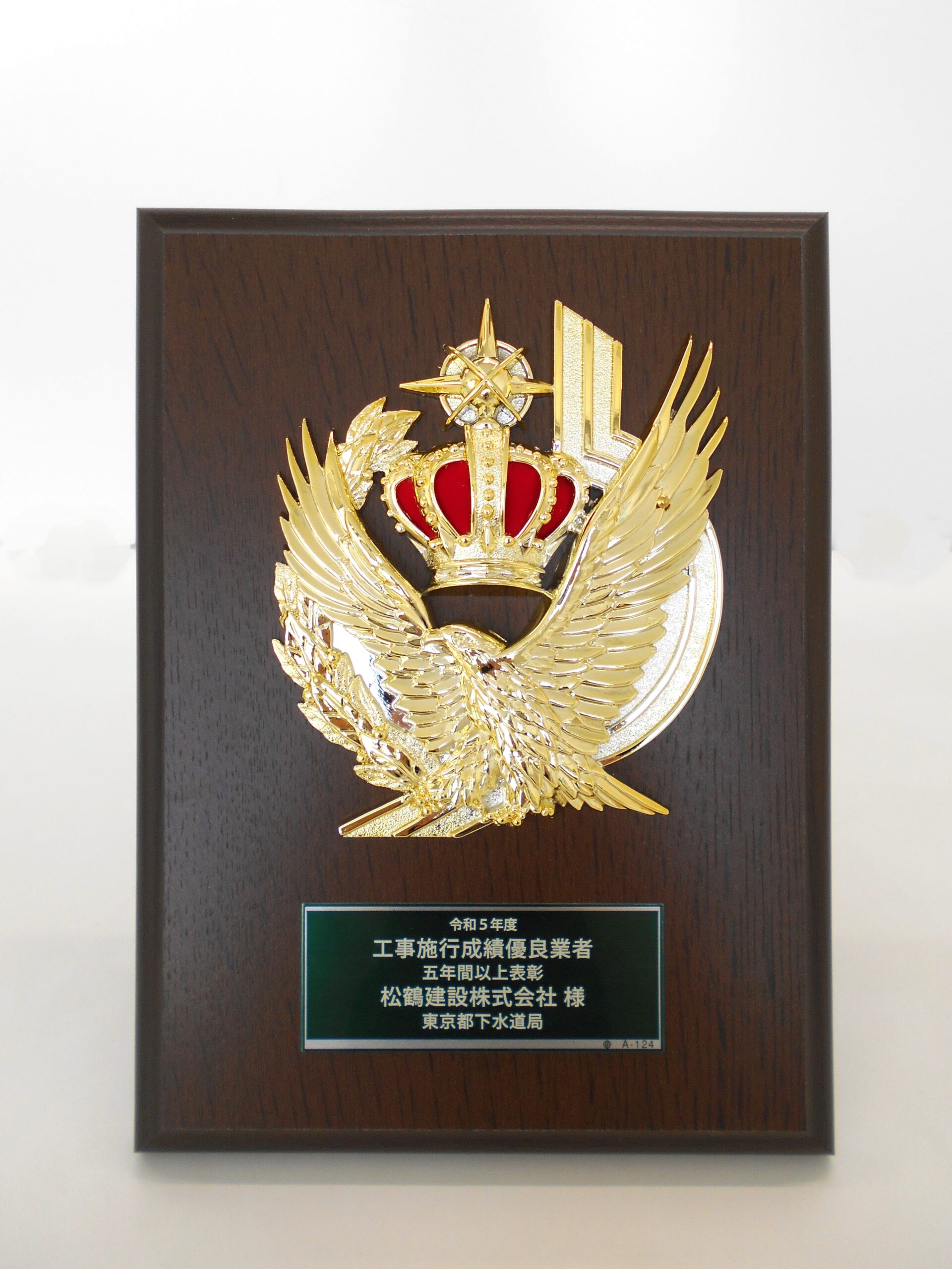 東京都下水道局の発注工事にて、成績が優良な工事を施行した業者として感謝状と盾を頂きました。