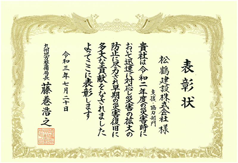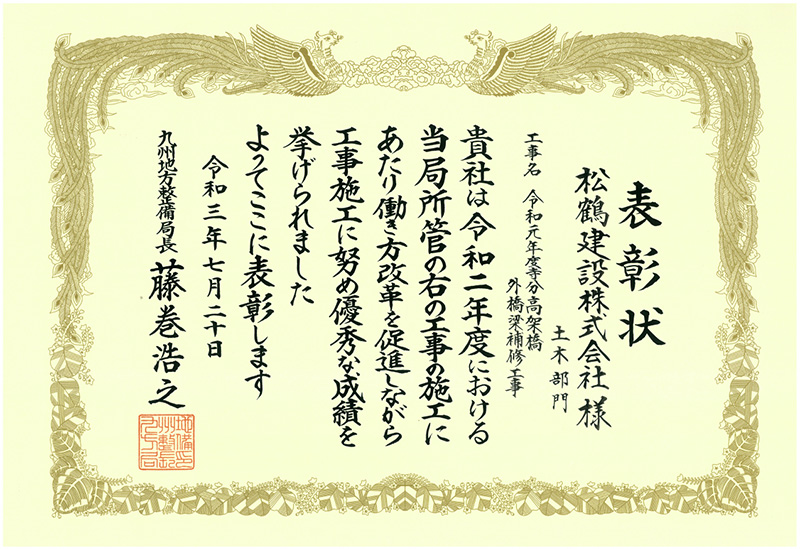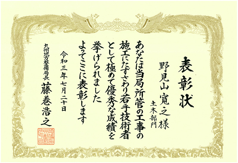 九州地方整備局より、「若手優秀技術者」「働き方改革促進優秀施工業者」ならびに「災害復旧等功労業者」として表彰されました。