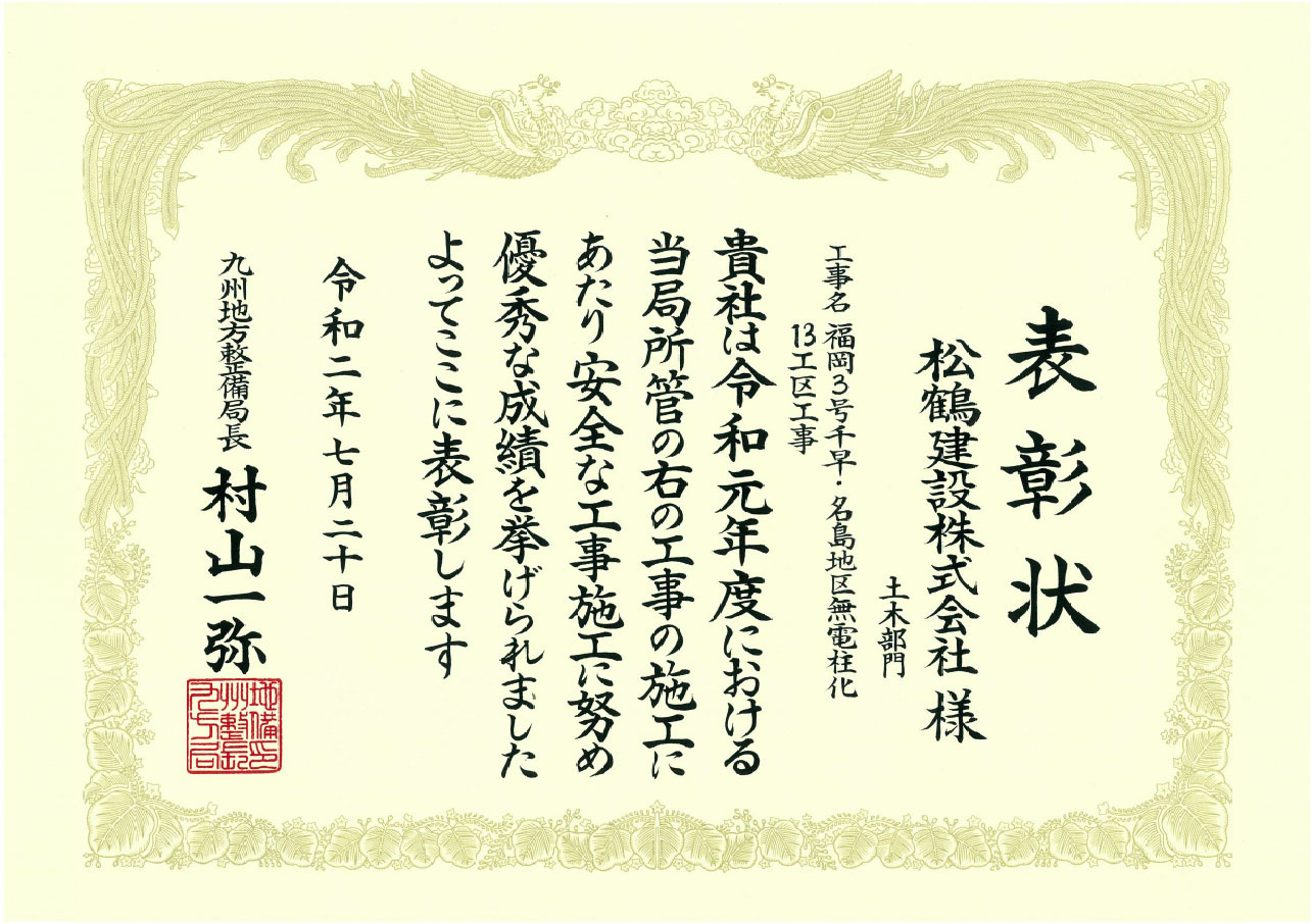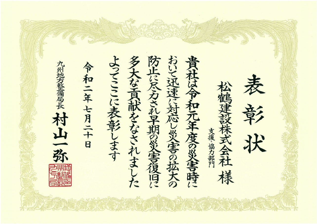 九州地方整備局より、安全施工業者ならびに災害復旧等功労業者として表彰されました。