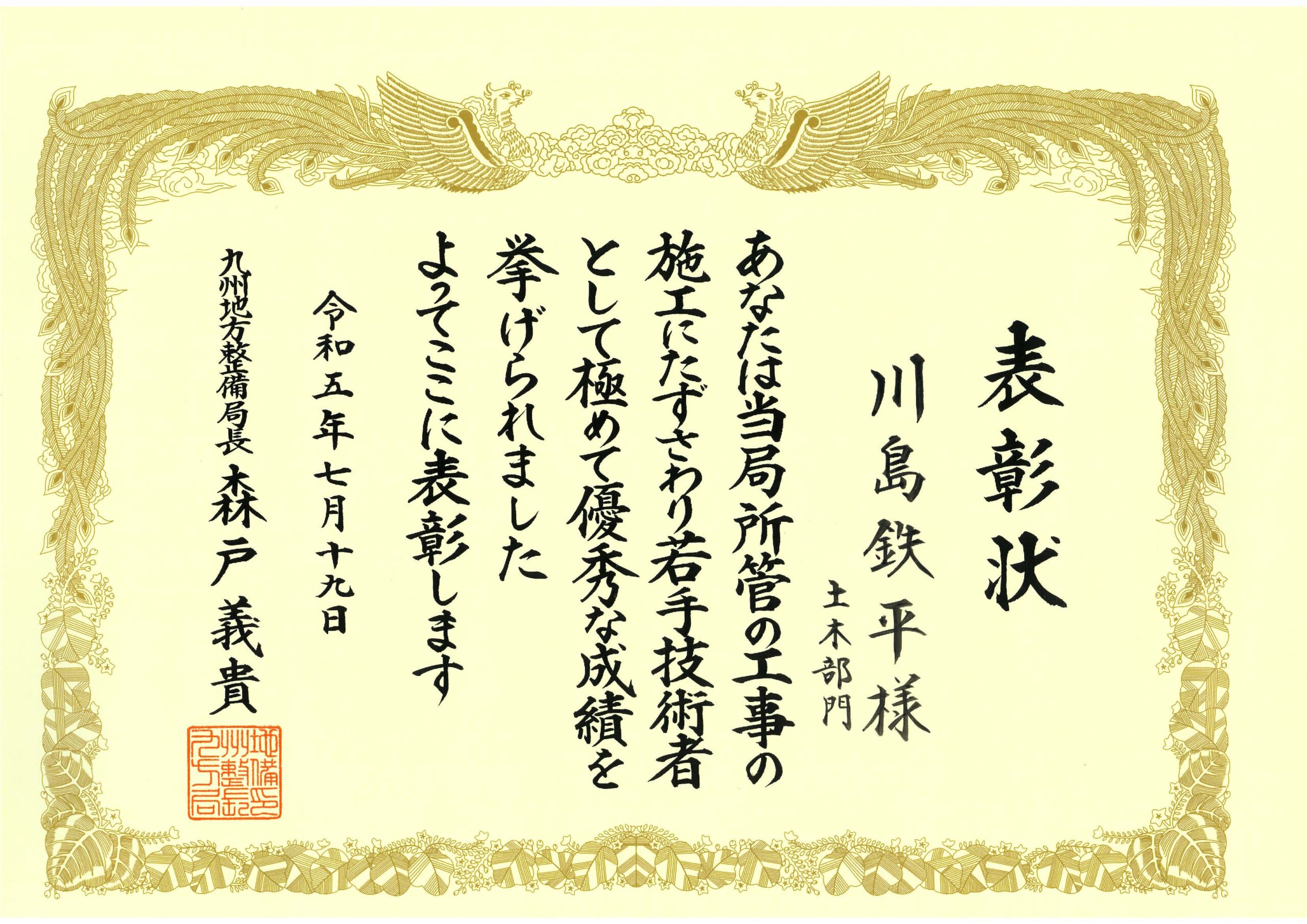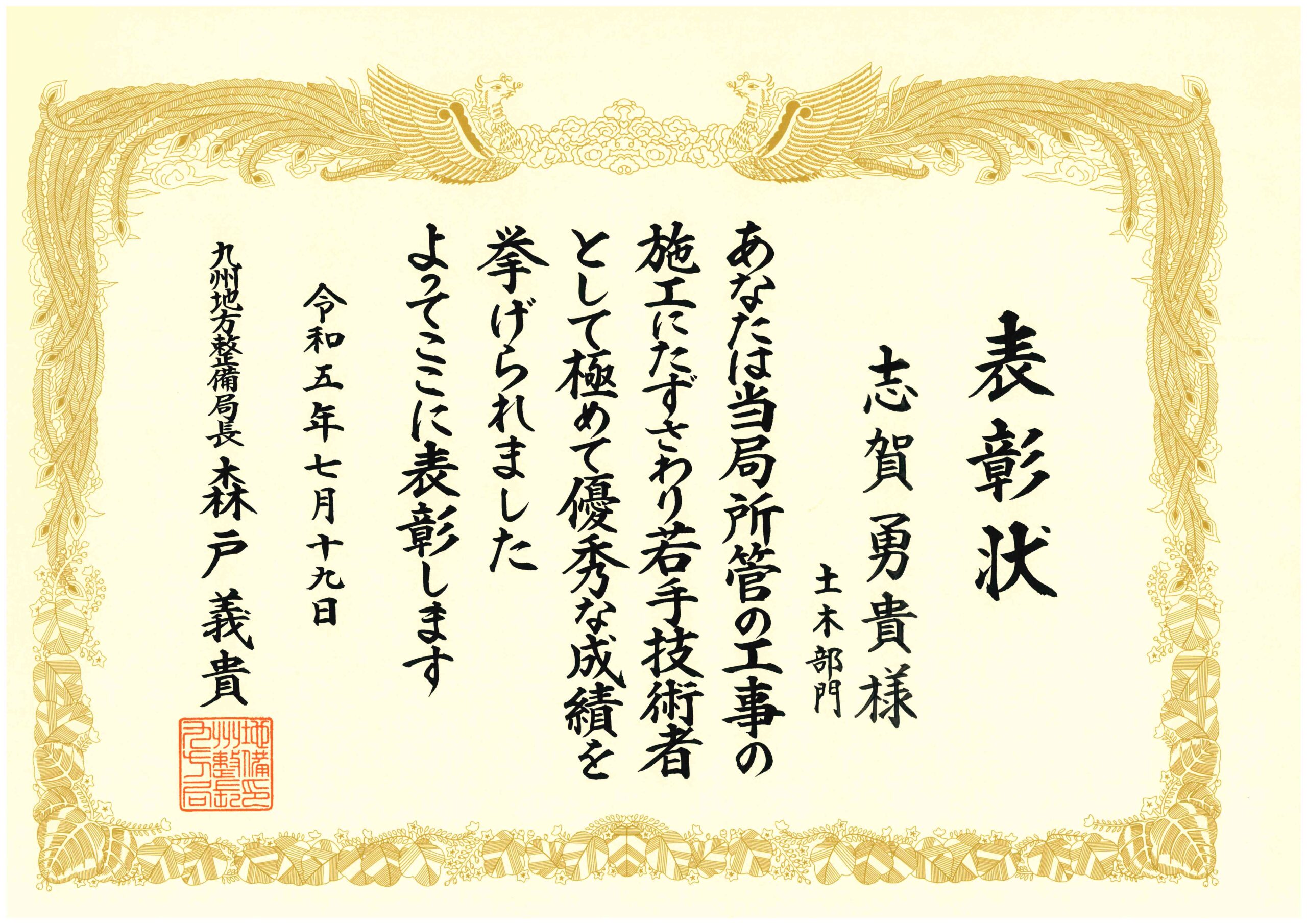令和5年7月19日、「若手優秀技術者」として九州地方整備局長より2名が表彰されました。