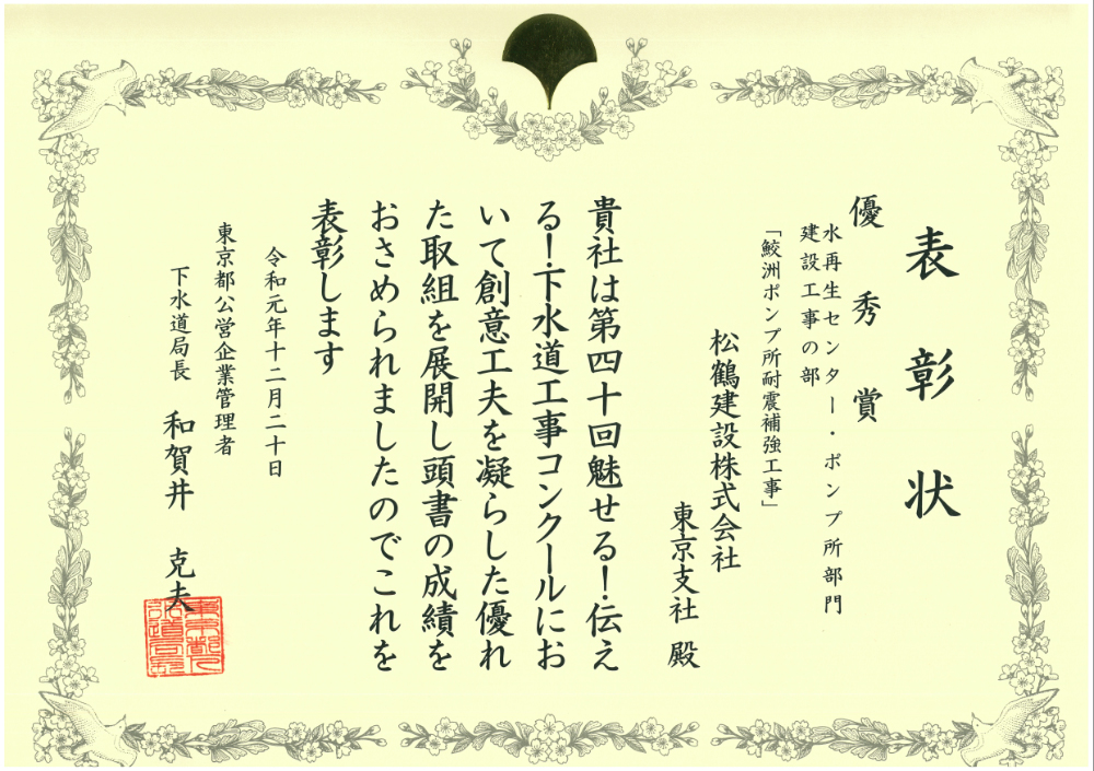 令和元年12月20日、東京都下水道局より2現場表彰されました。