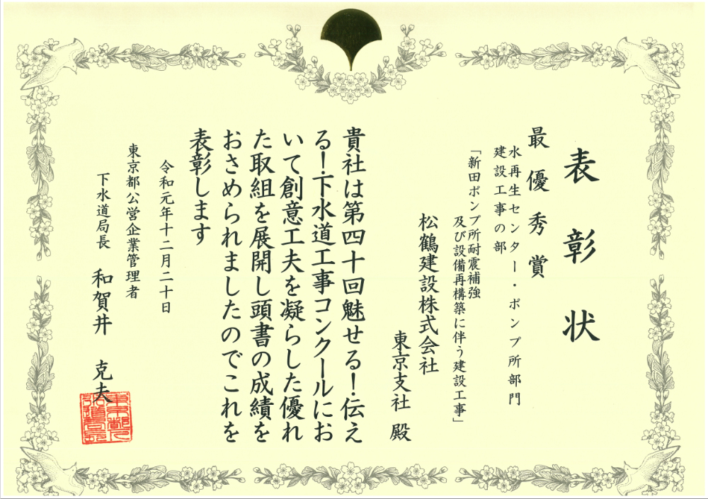 第四十回「魅せる!伝える!下水道工事コンクール」「水再生センター・ポンプ所部門建設工事の部」において最優秀賞と優秀賞のダブル受賞を受けました。
