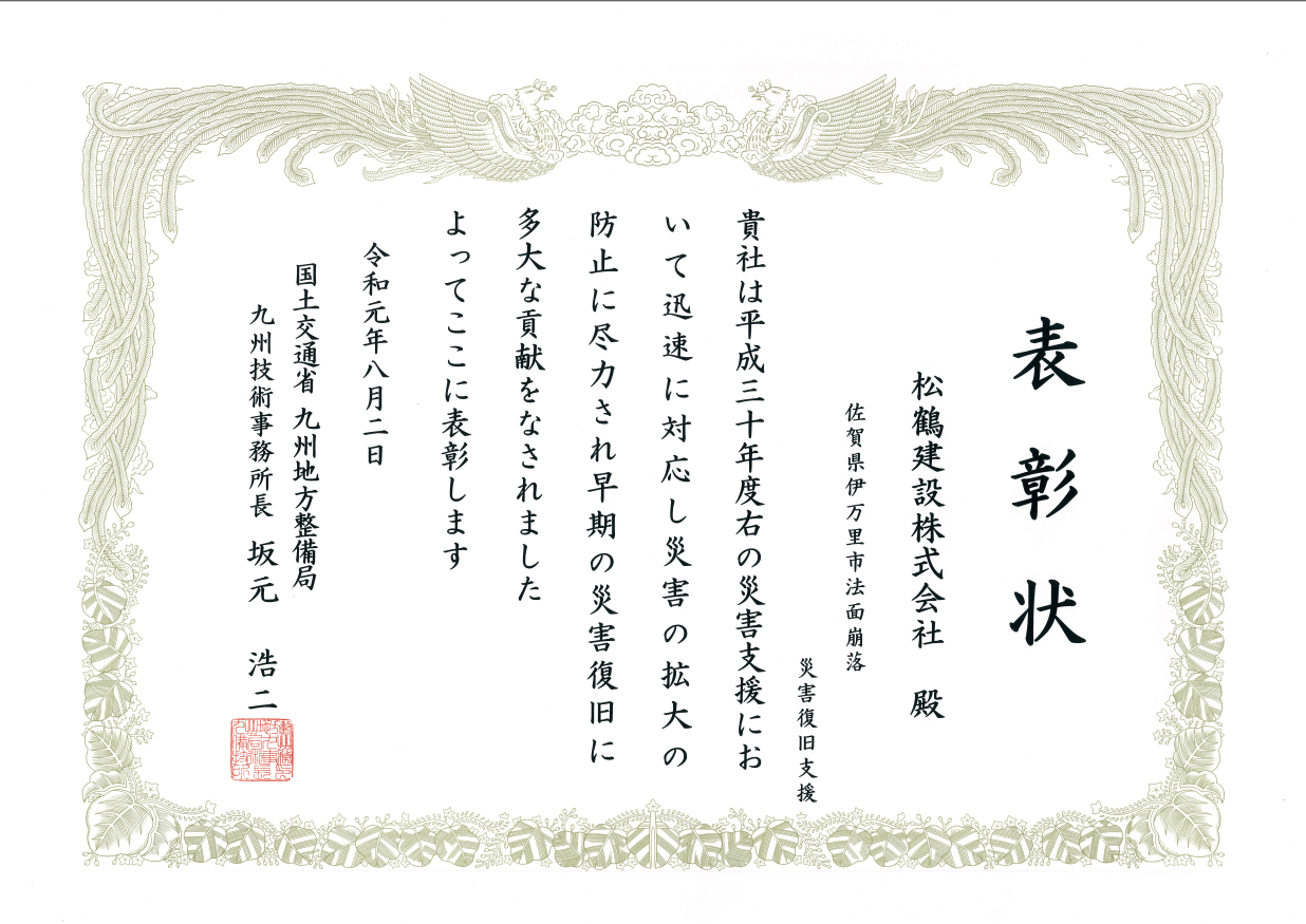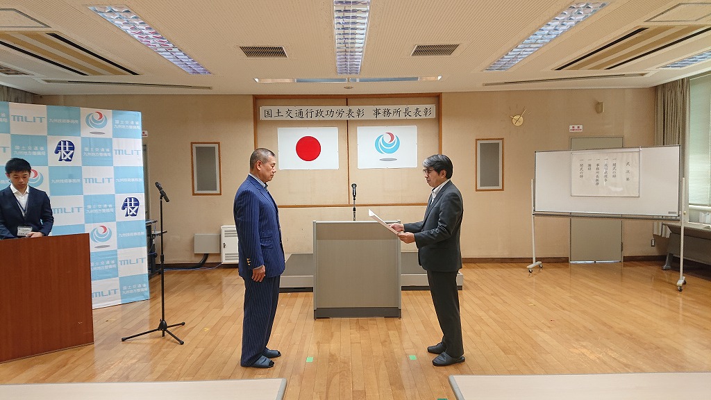 令和元年8月2日、「災害復旧支援」を行い九州地方整備局 九州技術事務所より表彰されました。