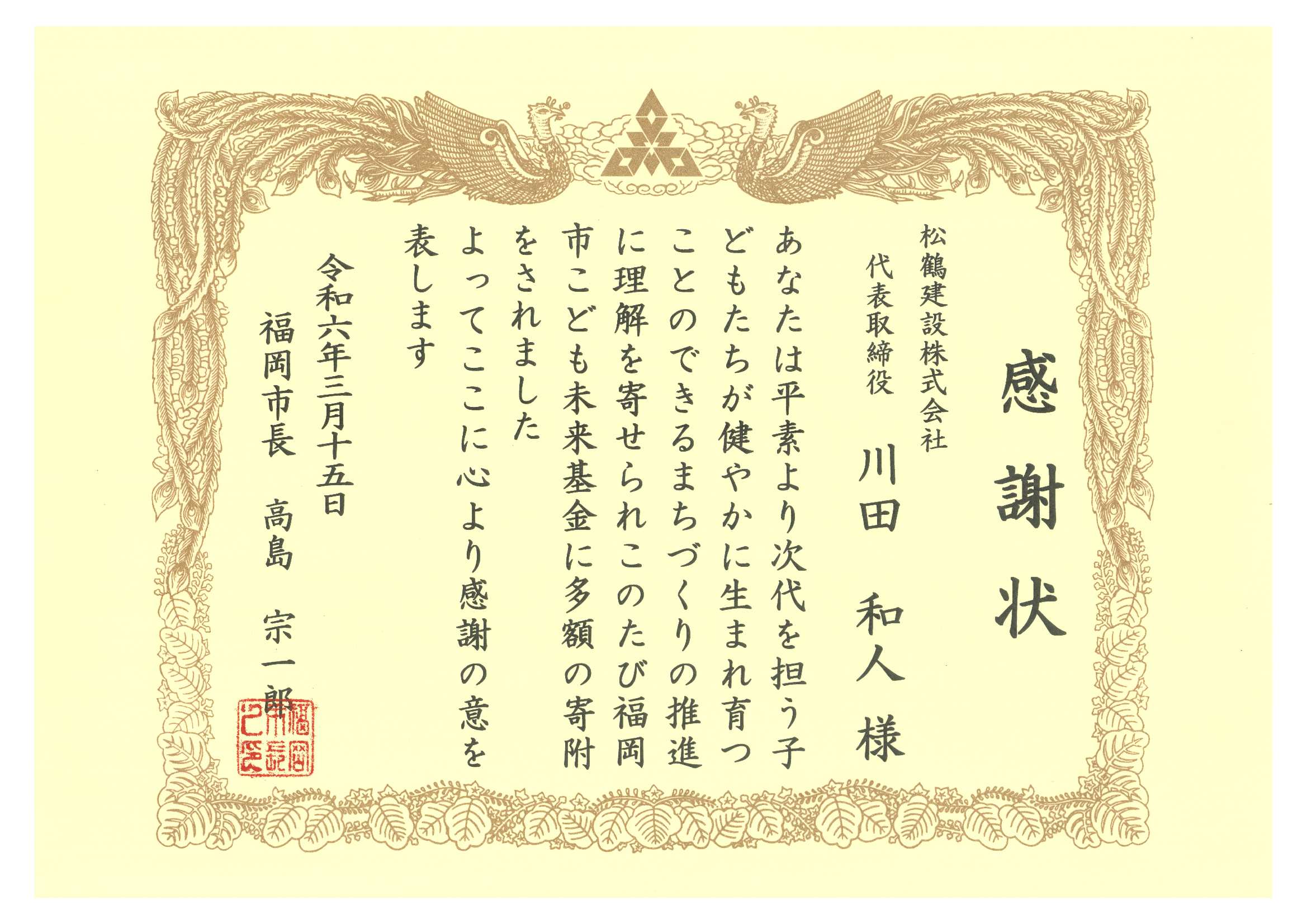 社会貢献の一環として、株式会社北九州銀行保証付の寄付型私募債を発行し、その一部を「福岡市こども未来基金」に寄付を行ったことに対し、福岡市より感謝状を頂きました。