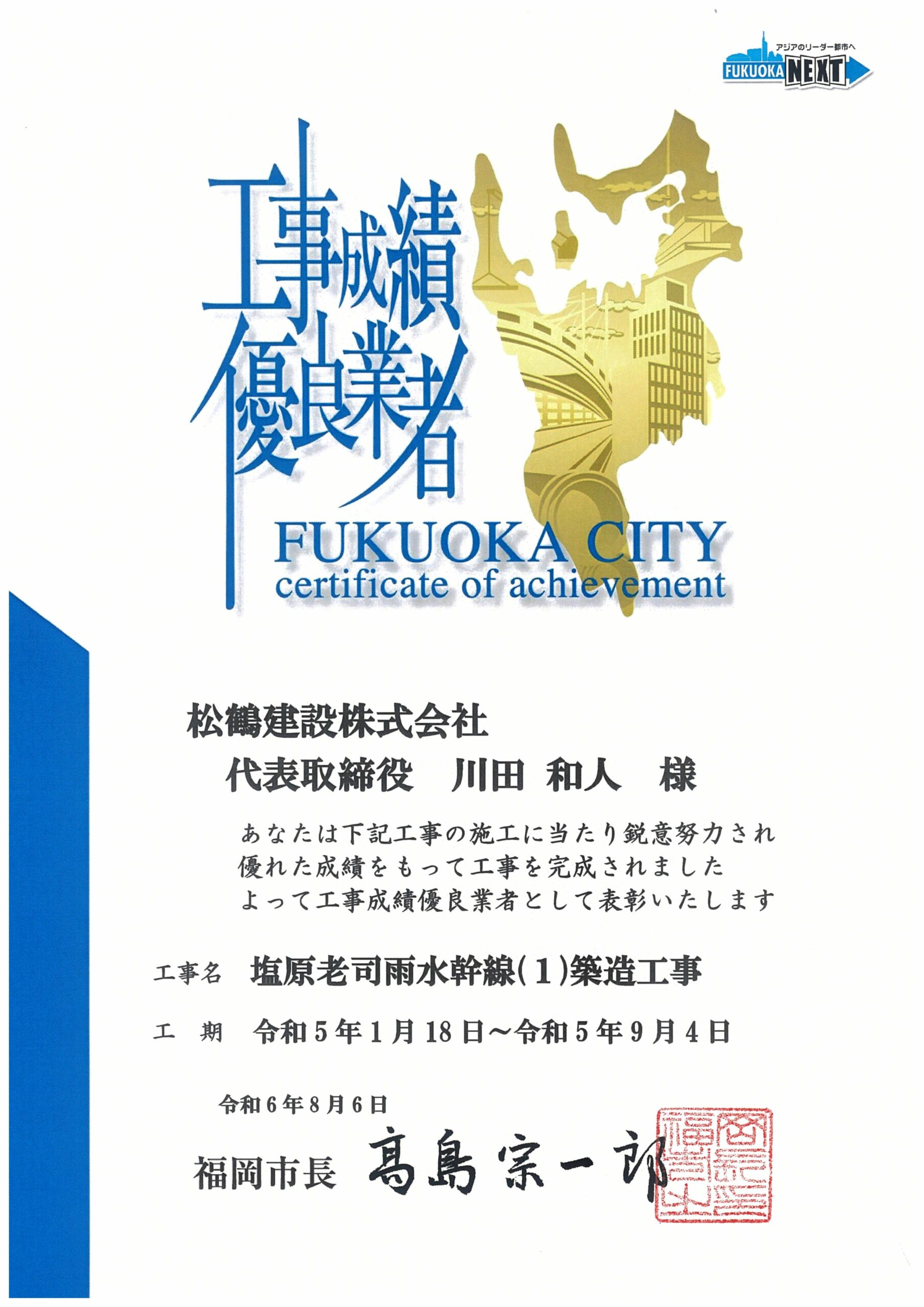 令和6年8月6日、福岡市より「工事成績優良業者」として表彰されました。