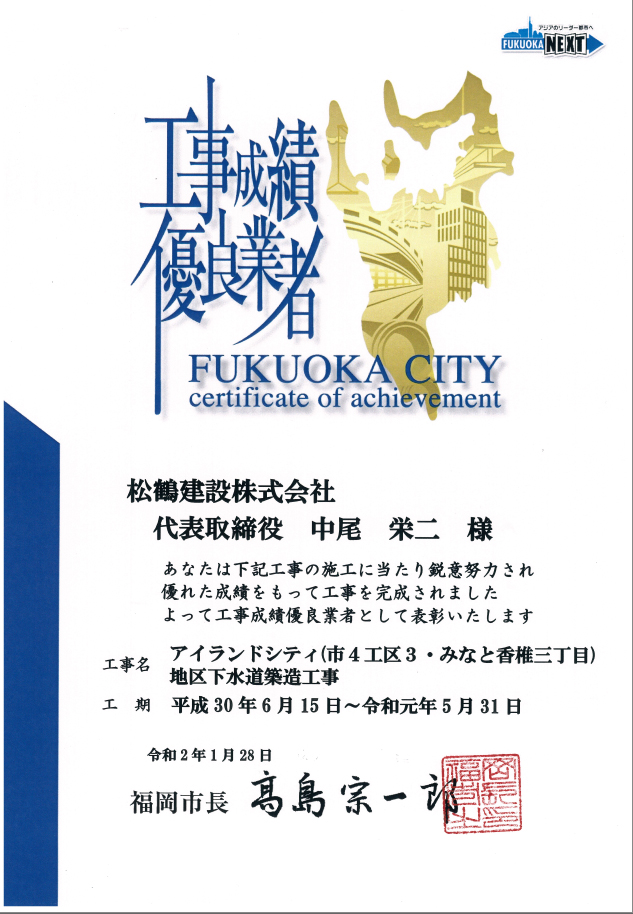 福岡市より、工事成績優良業者として表彰されました。