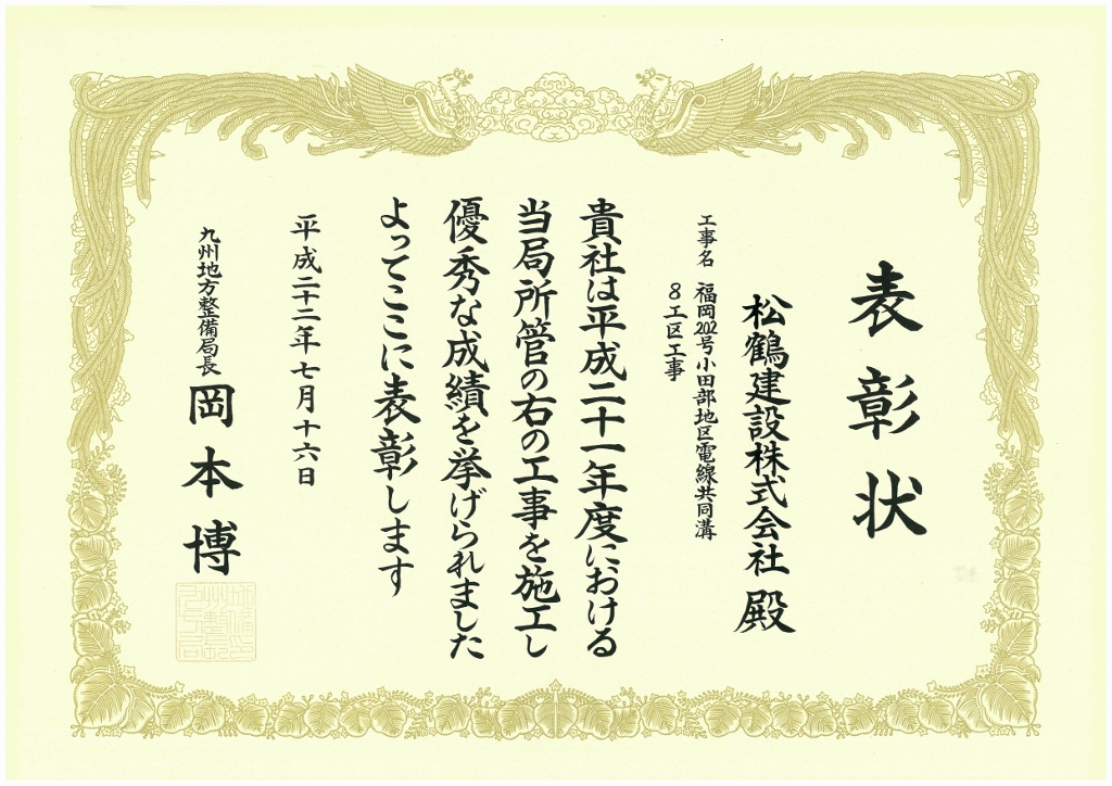 九州地方整備局長表彰(優良施工) ・電線共同溝(施工延長L=180m管路部延長L=110m)