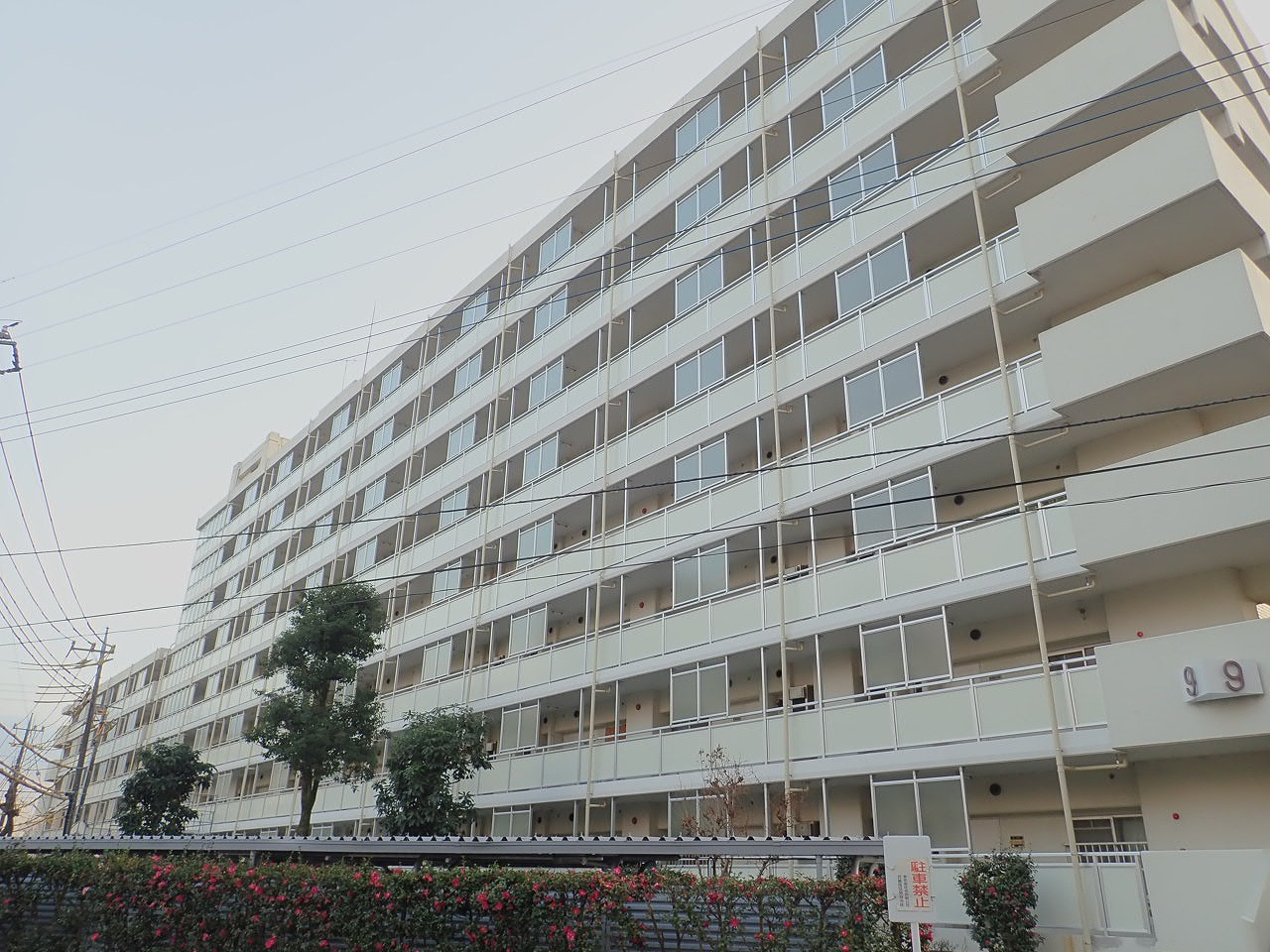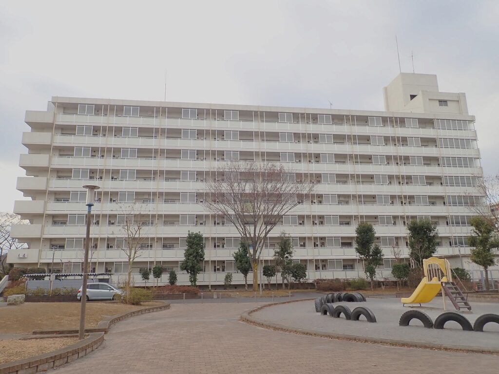 SRC造 地上8階 S59年建設 4号棟 64戸 9号棟 84戸 最高高さ 34.65m 付帯施設 受水槽、自転車置き場、直接仮設工事 4号棟 1,391m2 9号棟 1,823m2 外部足場架設、廊下手摺改修工事 アルミ製手摺(パネル) 1,047m、柱脚部撤去706箇所、廊下床支柱(床支持金具共) 341本、同(柱脚部含まず) 29本、柱脚部モルタル補修 706箇所、鉄部塗装工事 RC種ケレン 227m2 RB種(C)ケレン 3,198m2 錆止塗装 水性 1,383m2 鉛・クロムフリー 2,042m2 EPG 1回塗 1,085m2 2回塗 299m2 SOP1回塗 839m2 2回塗 1,202m2、雑工事 専有玄関 エアータイトゴム 117戸取替、各棟 玄関横スロープ庇 ポリカーポネード板 76.0m2 撤去・新設